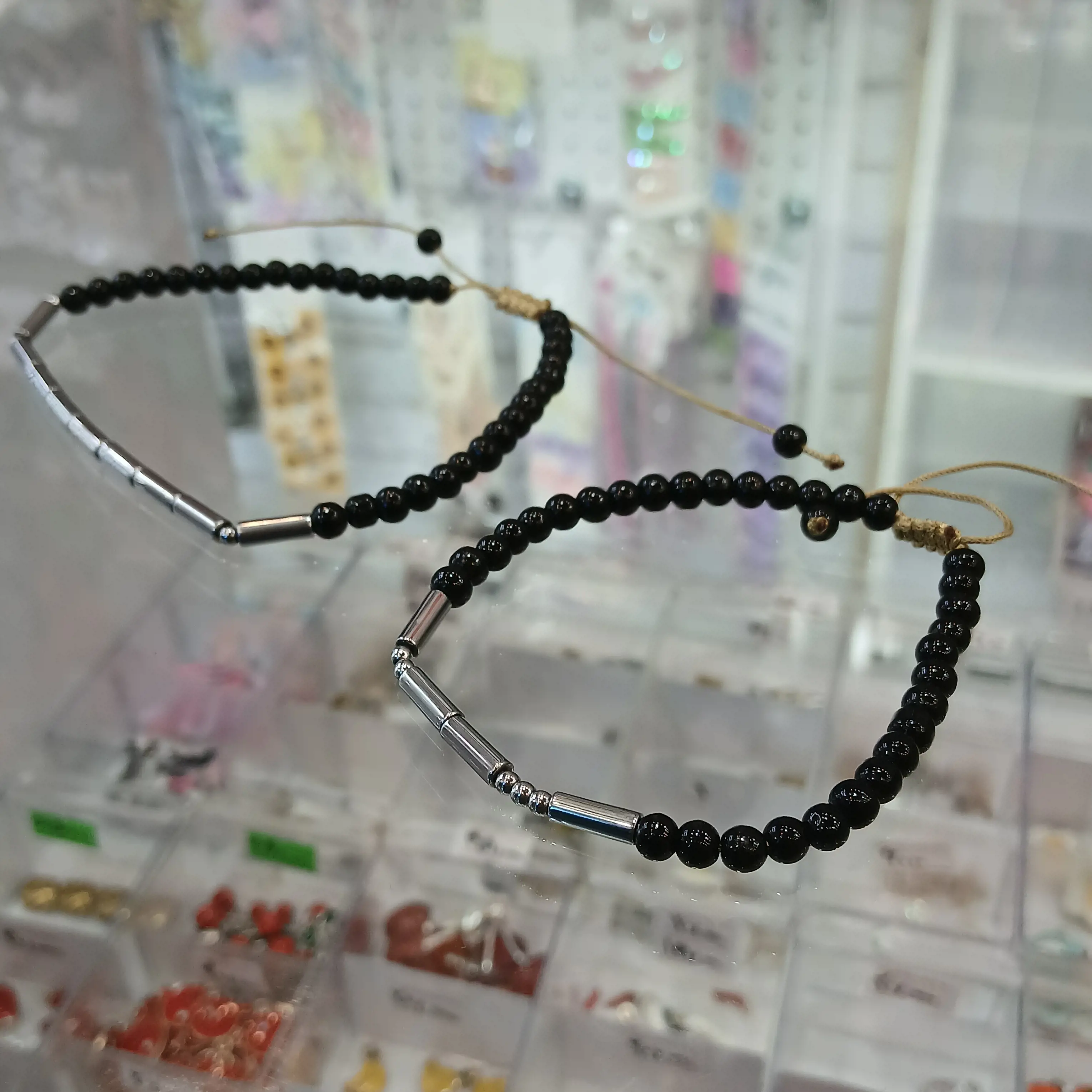دستبند های کد مورس به سفارش مشتری ساخته میشود با مهره فیمو، کریستال،و مروارید سفید و مشکی در اسم های انگلیسی و فارسی.