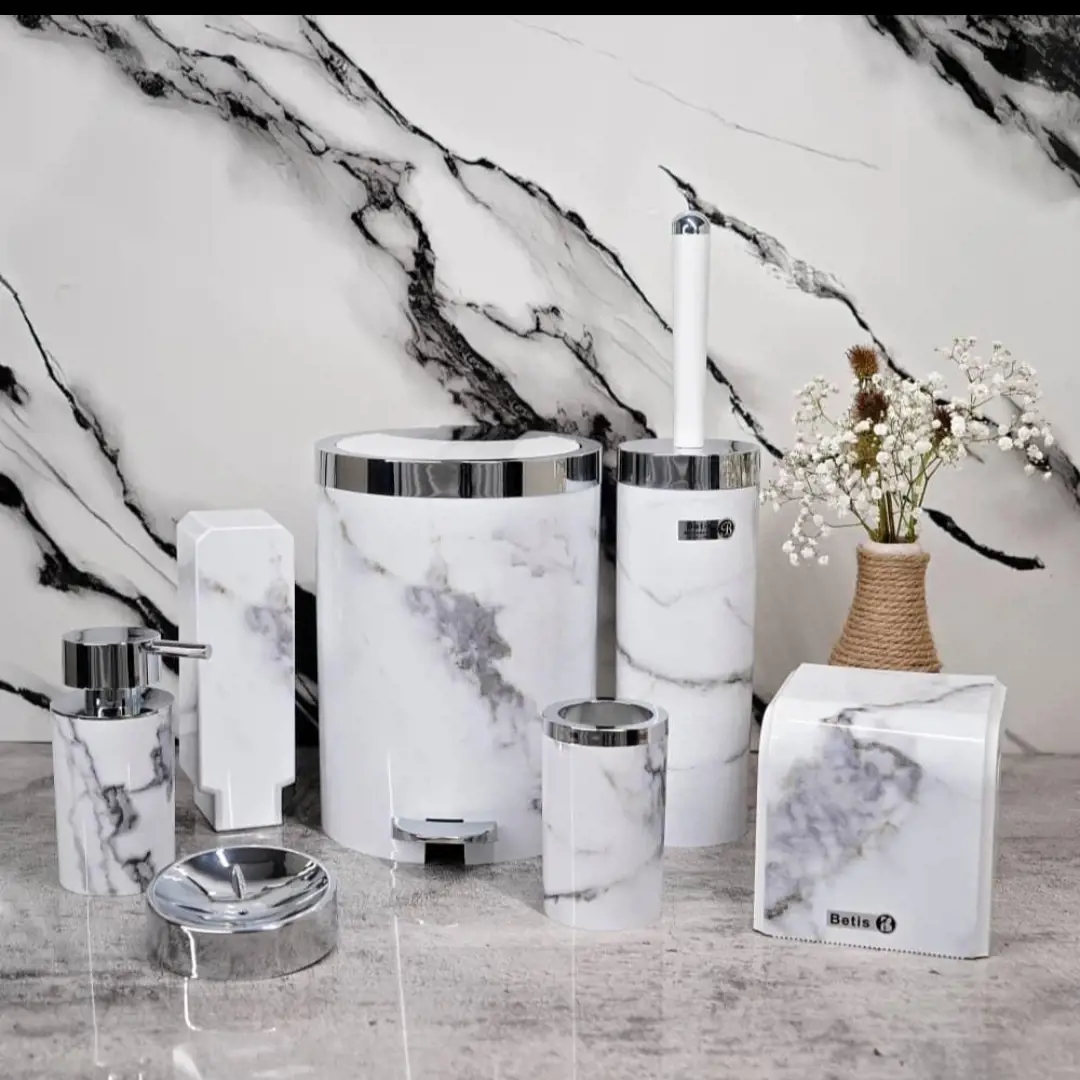 فروش انواع سرویس ۵ پارچه دستشویی در مدل و رنگ های مختلف با بهترین قیمت و کیفیت سطل و برس سرویس بهداشتی جامايع رومیزی جا دستمال کاوردار جامايع دیواری