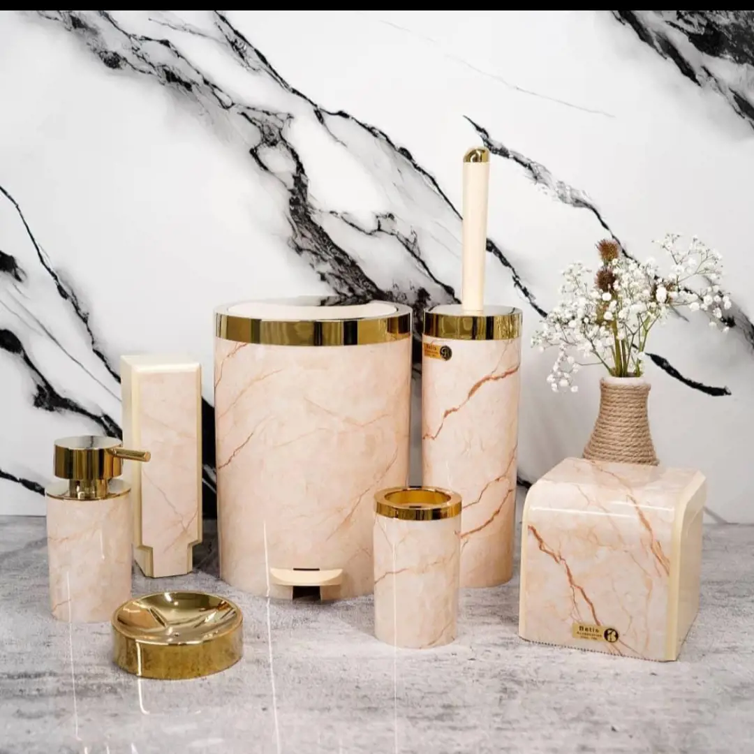 فروش انواع سرویس ۵ پارچه دستشویی در مدل و رنگ های مختلف با بهترین قیمت و کیفیت سطل و برس سرویس بهداشتی جامايع رومیزی جا دستمال کاوردار جامايع دیواری