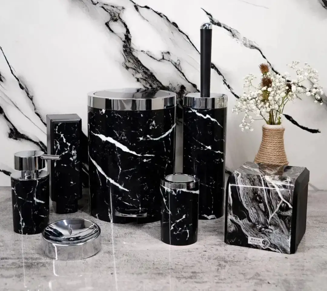 فروش انواع سرویس ۵ پارچه دستشویی در مدل و رنگ های مختلف با بهترین قیمت و کیفیت سطل و برس سرویس بهداشتی جامايع رومیزی جا دستمال کاوردار جامايع دیواری
