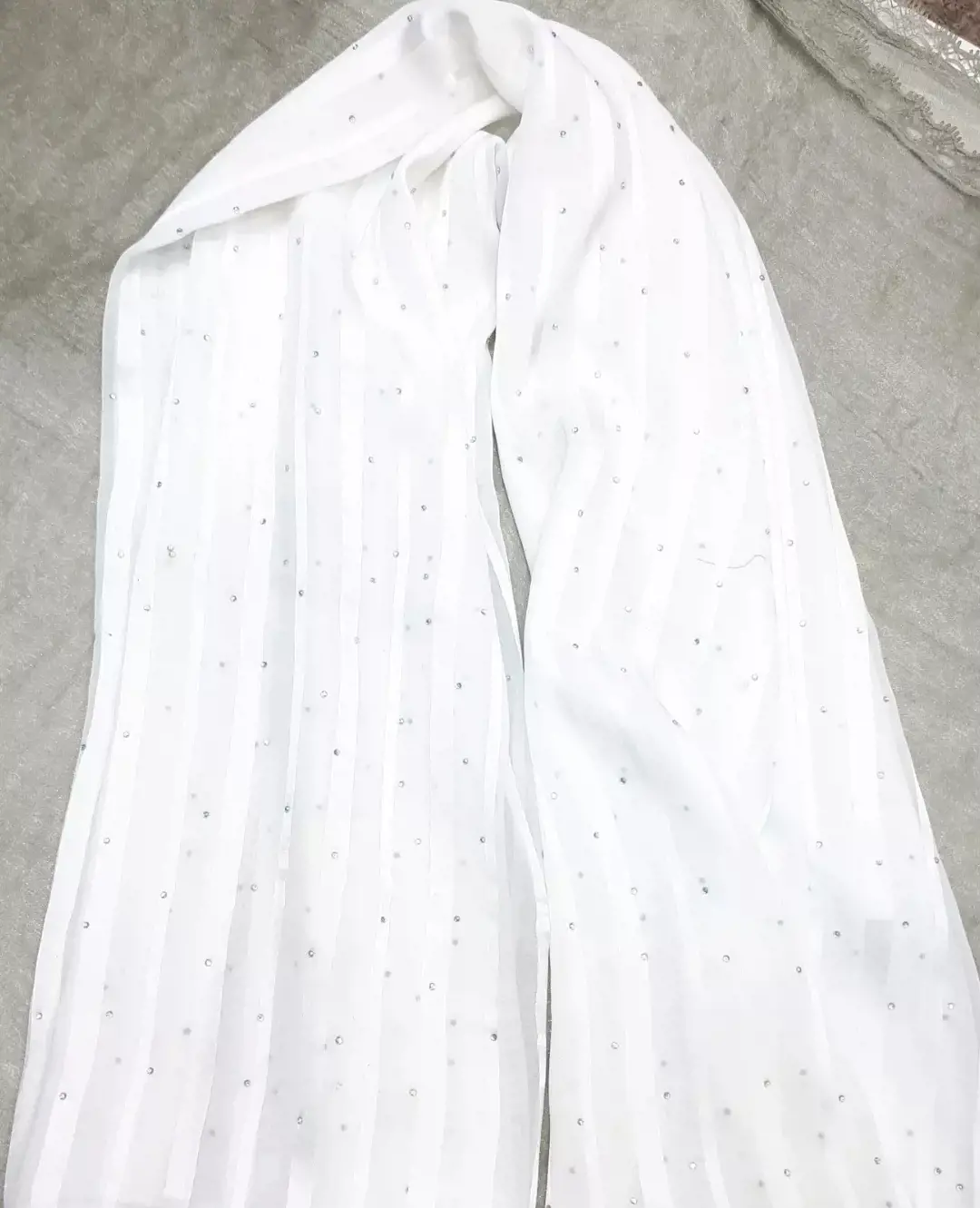 شال حرير یا خما نگینی فوق العاده نرم ولطیف نگیندار دور دوخت و منگوله ابریشمی تک رنگ سفید اندازه ۷۵۲